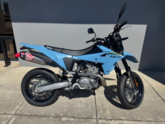 Price includes a Yoshimura slip on exhaust and fender eliminator! Building on Suzuki's industry leading SuperMoto, the all-new 2025 DR-Z4SM is here. This motorcycle redefines SuperMoto performance, built for riders who crave agility and excitement on the street and track. An all-new twin-spar steel frame and aluminum subframe provide a lightweight, high-performance chassis. The redesigned 398cc engine, featuring electronic fuel injection and 42mm Ride-by-Wire throttle body delivers smooth, responsive power. Suzuki's Intelligent Ride System (S.I.R.S.) puts advanced features at your fingertips. With three-level Suzuki Drive Mode Selector (SDMS) and a four-mode Traction Control System, you can tailor the bike's performance to match your riding style and conditions. Switchable ABS provides added functionality, whether you're navigating city streets or carving up a racetrack. The DR-Z4SM's 17-inch wide-spoke wheels are designed to allow an aggressive SuperMoto feel that this motorcycle can achieve. Fully adjustable KYB suspension and new Dunlop SPORTMAX Q5A tires ensure optimal handling and grip. Sleek LED lighting, vibrant bodywork, and ergonomic touches complete the motorcycle, making the DR-Z4SM the ultimate package.